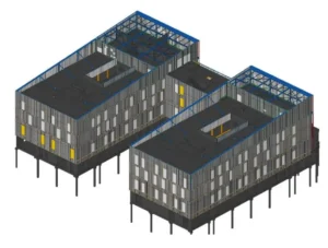 À partir des maquettes numériques 3D fournies par la maîtrise d’œuvre AIA, le bureau d’études de Tradition Bois a converti les données en plans d’exécution (EXE et PAC), optimisant ainsi la répartition des montants d’ossature et des voiles travaillants en panneaux fibres-gypse.